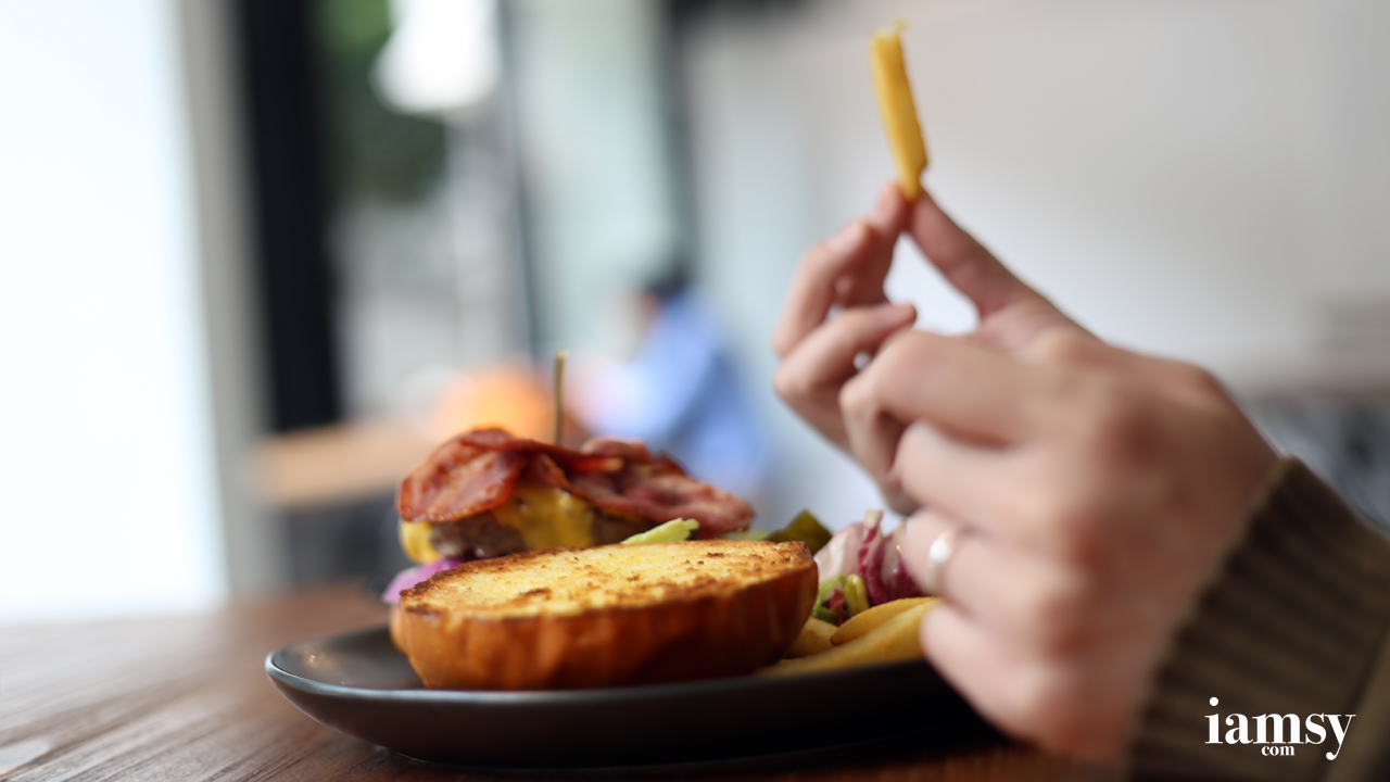 店員服務態度超級好,飽飽的我和 yellowbean 點了 Salmon Risotto 和 Bacon Burger。已經超久沒吃過 risotto 的我口裡吃著好滿足,雖然沒有高水平卻是讓我餓了意大利飯好久的人覺得非常享受。 yellowbean 要求比較高,他覺得 burger 沒醬料的同時牛扒又不夠 juicy 就變成好 dry 好難入口。而且在點了 with egg 卻忘了給雞蛋啊(店員超友好地說可以給我們補回啦,不過雞蛋另上又似乎有點可笑,所以我們都決定不等雞蛋啦)。yellowbean 當上手模!吃薯條這個動作無論可時在看也覺得好誘惑就是啦。